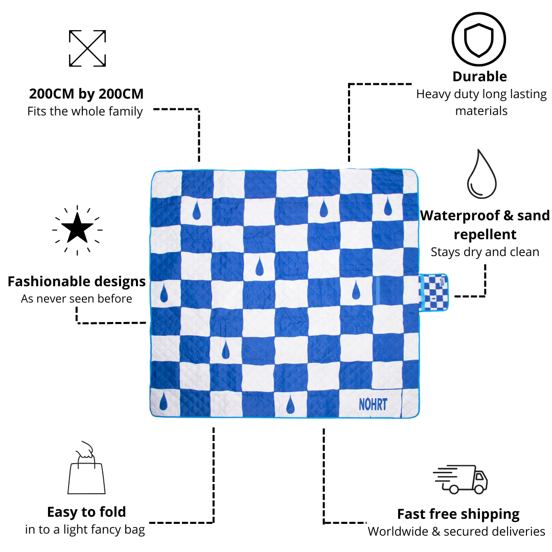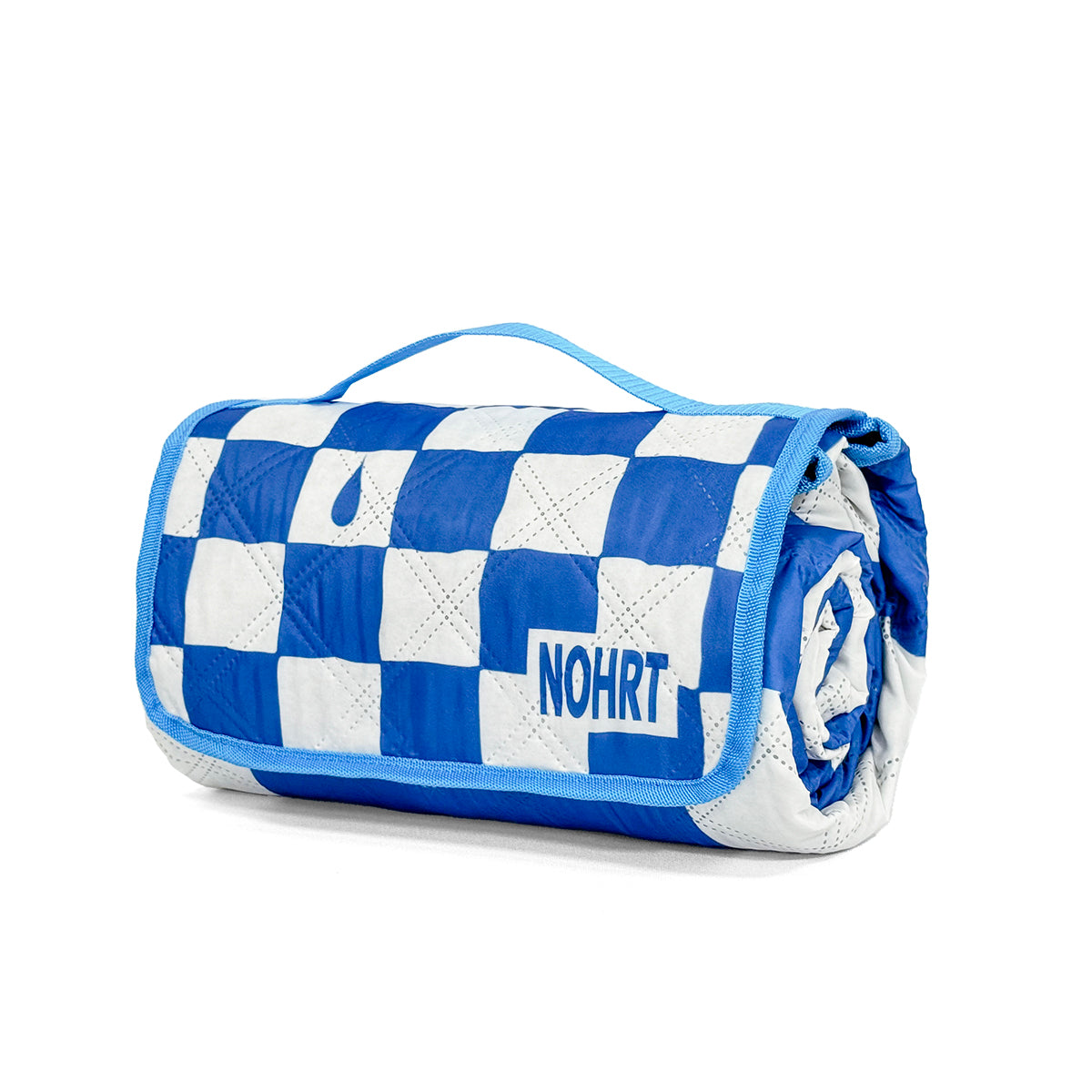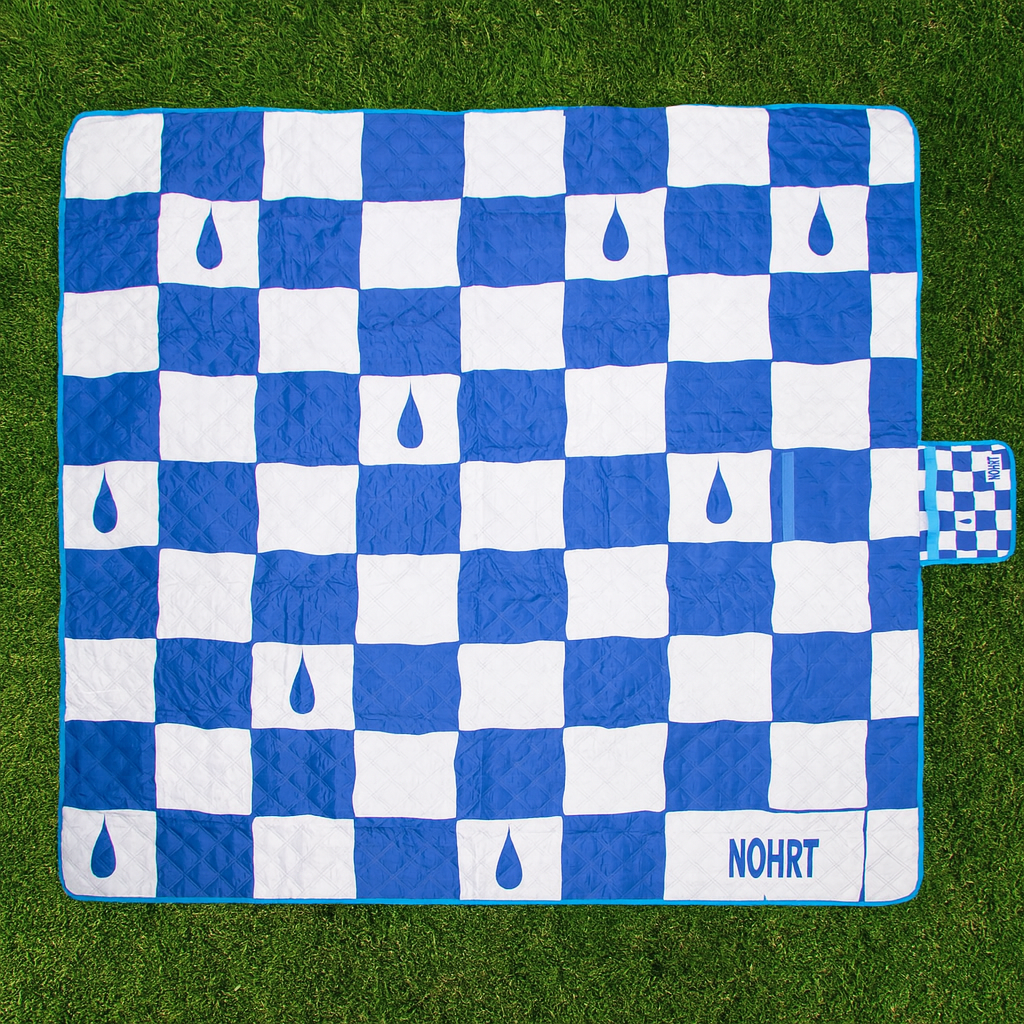 Elevate your outdoor setup with DRIP, a bold yet refined picnic blanket designed for people who value both form and function. Its striking blue-and-white checkerboard pattern, interrupted by subtle waterdrop accents, brings graphic sophistication to the park, beach, or rooftop hangout.